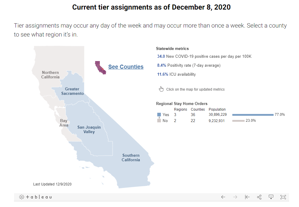 The current orders as of December 8, 2020 affect 99.9% of Californians. The stay at home orders, however, are broken down into five regions, which can be seen here: