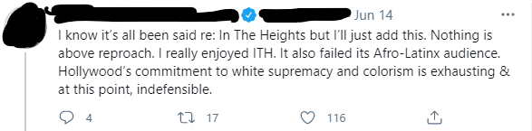 At some point people are going to have to accept that there are things out there that they will not like. But in order to have a tolerant culture, we must accept that there will be things out there we can’t tolerate. I know it sounds contradictory, and to some extent it is. But we make no progress and expose no culture and give no variety to life if the expectation is that only x person should play this role. This ridiculous level of demand will result in two things: projects like In The Heights underperforming in the box office, and the executives not wanting to make more of these projects because it both underperforms and draws criticism from social media and the internet social justice warriors.