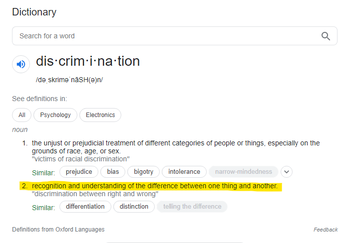 Critics would say that I believe in discrimination then, and they would be correct. I think that the word discrimination has taken on such a toxic and negative tone that we lose all objective and clinical meaning. Discrimination, as per Oxford Languages second definition reads as follows: